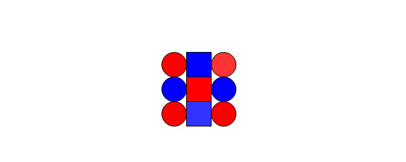 Посмотрите на этот рисунок – на нем можно увидеть повернутый крест красного цвета, ромб синего цвета или три параллельных столбика. Это понятно, как понятно и то, что увидеть одновременно все три фигуры невозможно – можно отчетливо видеть только одну из них – ту, на «пространство» которой настроено наше виденье. Но это не все – посмотрите на рисунок внимательно и скажите – не видите ли вы там чего-то необычного – какого-то отклонения от «правильной картины». Вряд ли вам удастся что-нибудь обнаружить даже после того, как я скажу вам, что верхний правый круг и нижний квадрат окрашены цветом меньшей интенсивности – на 20%. Разница существенна и различие должно быть отчетливо видено, но большинство людей его действительно не видит – потому, что воспринимает объекты как часть картины, то есть видит то общее (цвет), что в них есть. И не видит ничего другого – того, что могло бы быть отражением Индивидуальности объекта. Не хотят видеть – потому, что подобное виденье мешает нам соединить объекты в единое целое – в привычную Картину Мира.