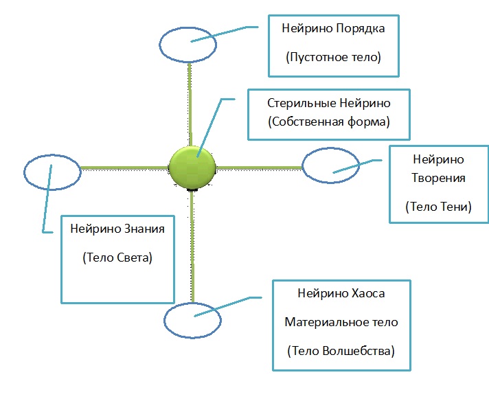 Нейрино Порядка является основой Пустотного Тела – нашего сознания. Нейрино Творения оказываются центром Тела Тени – нашего Пространственного Тела. Нейрино Хаоса становятся основой нашего физического тела, а Нейрино Знания – центром Тела Света, нашей волновой формы. Вернее, так могло бы быть, если бы не наклон «креста Воли». В действительности наша структура выглядит так: