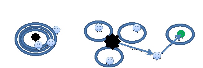 Здесь все ясно – черные восьмиугольники – отношения Иерархии (равенства) – слева – в достаточно сложном Узоре типа Узора власти. Посередине – при создании и реализации собственных Узоров – здесь они возникают при сравнении нашего «дома» и «дома» соседей. А правый вариант – использование энергии аккумулятора Иерархии для создания Солитона – который в дальнейшем будет раскручивать Узор сам.