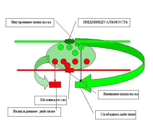 Другая структура – это наше маленькое «я». Оно образовано как раз элементами внешнего мира, соединенными в более или менее целостную Картину мира, которую мы сами рассматриваем как воплощение нашей ИНДИВИДУАЛЬНОСТИ. Определенный смысл в этом есть – Картина мира каждого действительно индивидуальна, но вся проблема в том, что она лишена внутренней основы. Каждый её элемент гораздо сильнее связан с внешним миром, чем с нашей ИНДИВИДУАЛЬНОСТЬЮ, поэтому наше «я» зависит от «внешних импульсов» и подчиняется им, следуя заданной программе. А эта программа всегда противоречит тем «внутренним импульсам», которые исходят из нашей ИНДИВИДУАЛЬНОСТИ – как раз та разница между свободным и вынужденным действием, о которой мы говорили.