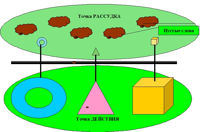 Каждое ЕСТЕСТВЕННОЕ слово имеет громадную «подводную часть». Те несколько букв, которые мы произносим в точке РАССУДКА – это только видимая нам «вершина айсберга». В глубине – в точке ДЕЙСТВИЯ – невидимые нам структуры, непосредственно связанные с самой реальностью, а в предельном случае – образующие её.