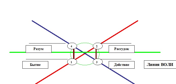 Всё сказанное выше относилось либо к Левой стороне мира, либо к его Правой стороне. Но ещё в первых рассылках мы говорили о том, что наша внутренняя структура имеет крестообразную форму – точка Разума (Мудрости) соединена с точкой Действия, а точка Рассудка соединена с точкой Бытия. То есть каждый акт нашего действия, равно как и акт познания связан с переходом с одной стороны нашего мира на его другую сторону, с трансформацией Силы Света в Силу Тени и наоборот.