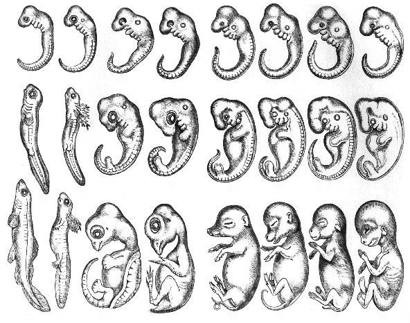 Мы знаем, что будущее существует внутри нас на материальном уровне. Есть хромосомы, определяющие развитие тела – то есть его изменения во Времени. Изменения, которые не ограничиваются только нашей нынешней жизнью – зародыш проходит через все этапы эволюции. Вот, например, как выглядит развитие зародыша позвоночных – а значит и человека: