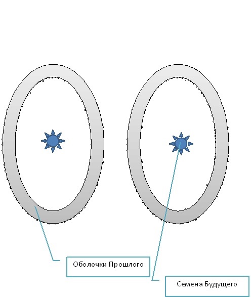 Любая «оболочка прошлого» – относительно целостный фрагмент когда-то пройденного нами Узора. Например, завершенные отношения с каким-то человеком – когда-то они начались, в какой-то форме продолжались, а потом завершились – из подобных замкнутых фрагментов как раз и создаются «оболочки прошлого» – что-то вроде существующих в нас энергетических сфер. Нестабильных сфер – наше прошлое почти всегда несовершенно. По крайней мере мы знаем, что многое стоило бы сделать по-другому. А несовершенство прошлого вызывает напряженность в «оболочках», которая может привести к их разрушению. Для снижения такой напряженности создается внутренний центр, включающий напряженность в себя – это и есть «семя будущего». Которое во многом и предопределяет все, что с нами будет происходить.