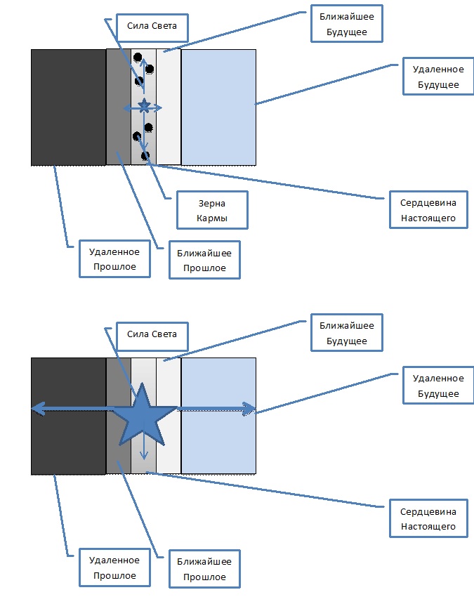 Наше место внутри лепестка определяется нашим кармическим телом – чем оно больше, тем «ниже» мы находимся и тем дальше удалены от центра. Соответственно, тем в меньшей степени мы можем управлять ближайшим Будущим. Это понятно – когда мы загружены какими-то проблемами, наша способность предвидеть будущее уменьшается почти до нуля. И уж тем более способность управлять им. А любая нерешенная «проблема» – это «зерно кармы», окруженное «оболочкой прошлого» и включающая в себя «семя будущего». Чем больше таких «зерен», тем больше кармическое тело, а значит тяжелее наше Тело Света – тело, в котором мы можем путешествовать во времени. Будущее «разряжено», чтобы в него проникнуть, мы должны быть легкими. Если наше тело Света тяжелее, мы остаемся в настоящем. Но нередко оно бывает настолько тяжелым, что и в Настоящем мы удержаться не можем. Проваливаемся в прошлое настолько, что даже окружающий нас мир становится почти невидимым. Не говоря уже о Будущем. Так происходит, например, когда мы погружаемся в тяжелые воспоминания – в такой форме человек действительно ничего не видит вокруг себя. И уж тем более не строит никаких планов.