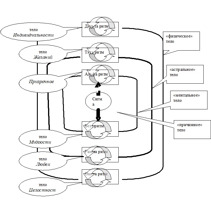 Таким образом, есть шесть форм существования человека, шесть форм правильных ритмов, которые раздвигают временные границы его жизни до громадных пределов. Но секрет в том, что эти формы связаны попарно между собой. И как раз их соединение образует то, что можно назвать четырьмя телами человека. Альфа-ритмы и бета ритмы формируют «ментальное» тело, тэта ритмы и гамма ритмы – «астральное» тело, дельта ритмы и омега ритмы – то, что обычно называют «физическим» телом, упуская из виду его важнейшую «святящуюся» составляющую.