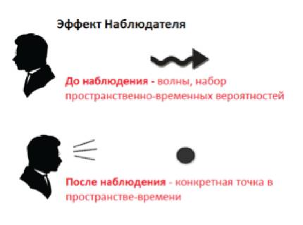 Мы говорили об опытах с прохождением электронов через щель – образуется дифракционная картина. Даже если пропускать электроны по одному – неизвестно, в какой точке электрон окажется после прохождения через щель. Но если в процесс включатся НАБЛЮДАТЕЛЬ, электрон ведет себя как частица. Траекторию которой можно рассчитать.