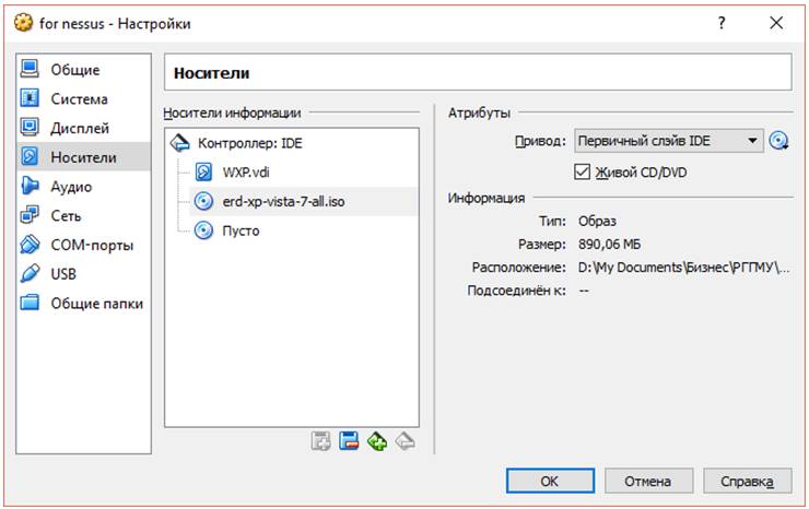 Изучаемый метод сброса пароля одинаково хорошо справляется с паролем любой сложности, потому что атакует средствами вышестоящего уровня: пароль защищается на уровне программного обеспечения, а атака производится с уровня аппаратного обеспечения [3]. Перед сбросом пароля необходимо выключить виртуальную машину. Затем подключить к ней образ с ERD Commander как оптический диск (рис. 2.3).