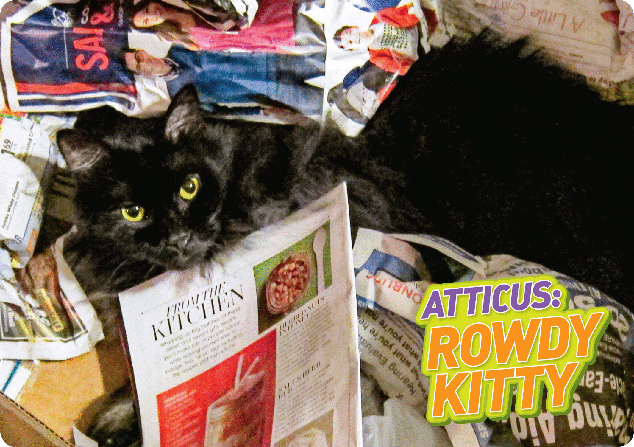 That didn’t slow Atticus down. Soon he discovered the garbage can. Instead of tipping it over, he leaped right inside it. Once, Candice started to toss eggshells in the garbage can, and there was Atticus. He was sitting in potato peelings, looking up at her. To solve the problem, Candice bought a new garbage can with a foot-pedal lid.