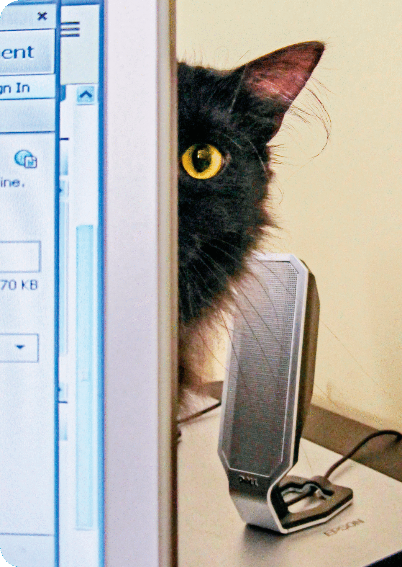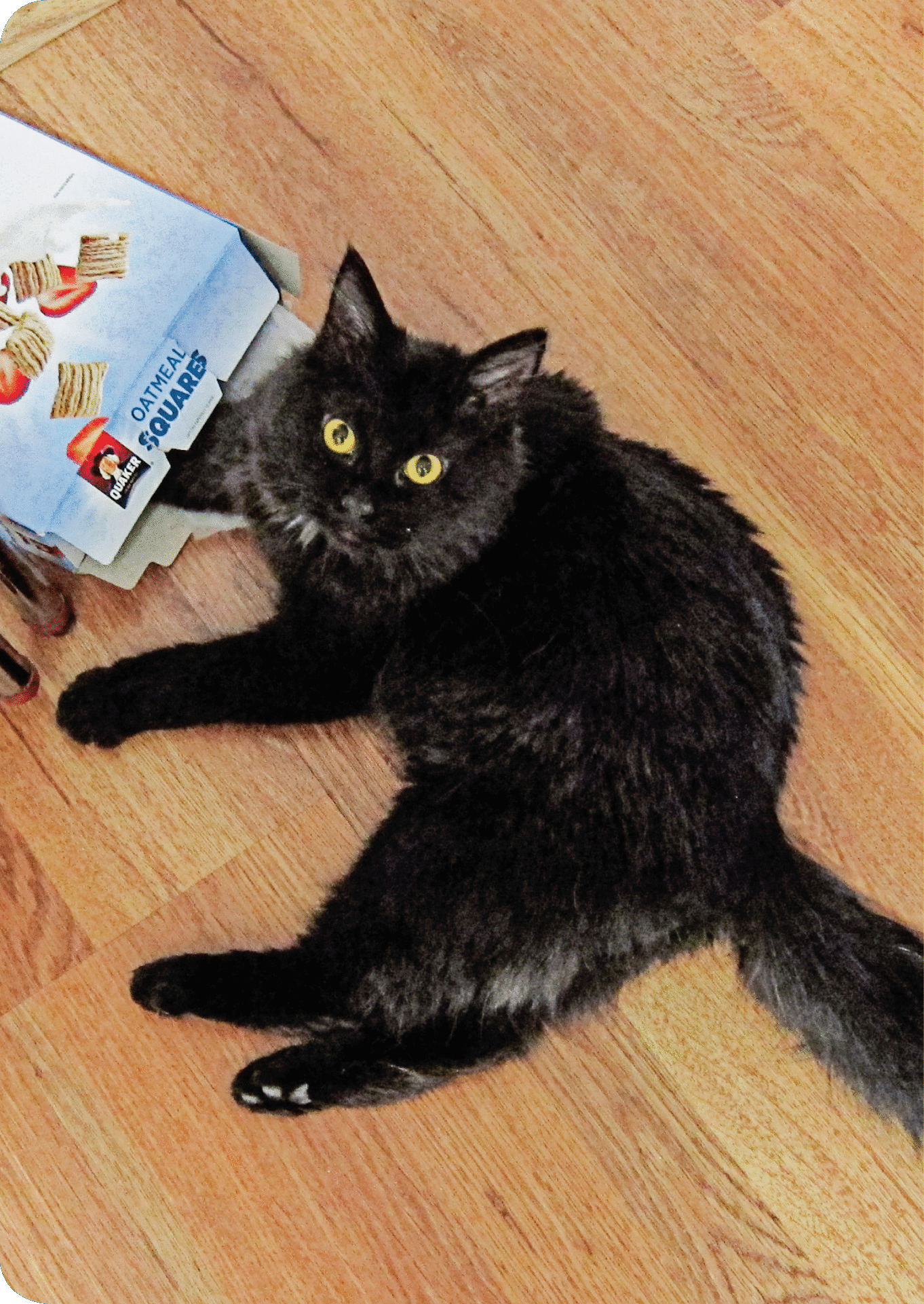 Kittens are supposed to get tired easily and take lots of naps. Not Atticus. He never seemed to sleep. He had boundless energy. Sometimes, Atticus disappeared. The first time he vanished, Candice worried he had slipped outside when she got the mail. “Atticus!” she called. No cat. She checked behind chairs and in corners. Then she peeked under the bed. Behind a box of shoes was a furry black shape. The cat was taking a hidden nap! So he did sleep, after all.