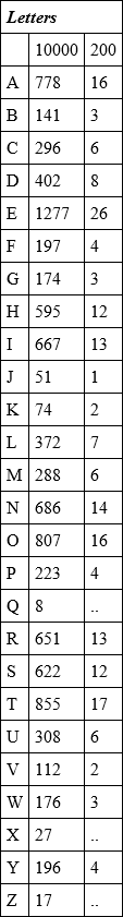 It was early found by the keen-eyed gentlemen who analyzed ciphers that if one took ten thousand words of any language and counted the letters in them the number of times that any one letter would recur would be found practically identical with their recurrence in any other ten thousand words. From this discovery the experts made frequency tables, which show just how many times one may expect to find a letter e or any other letter in a given number of words or letters. These tables were made for ten thousand letters and for two hundred letters, so that one might get an idea how often to expect to find given letters in both long and short messages or documents.