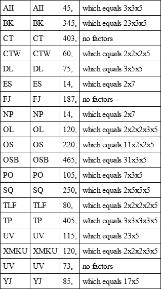 He factors the recurring groups like a small boy doing a sum in arithmetic when he wants to find out how many numbers multiplied by each other will produce a larger one. The number of letters between recurring groups and words is counted and dissected in this wise: