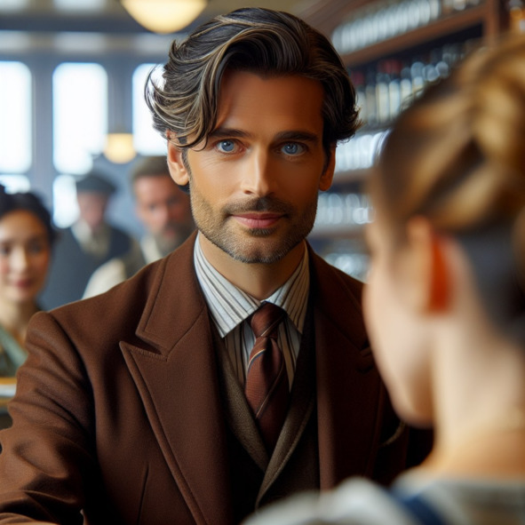 When getting to the counter, Katherine spotted a handsome man in his early forties sitting next to the window. His face features delicate, sharp, and manly. His thick brown hair with a little touch of grey to his tempeles and beard. The stranger was busy typing something on his laptop. He was wearing a chocolate-brown three-piece-suit with his jacket hanging on the chair back. Suddenly the man raised his eyes from the screen and they shared a glance.