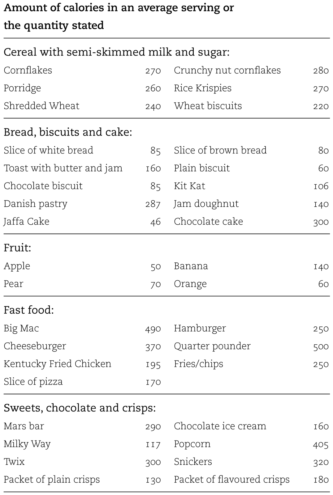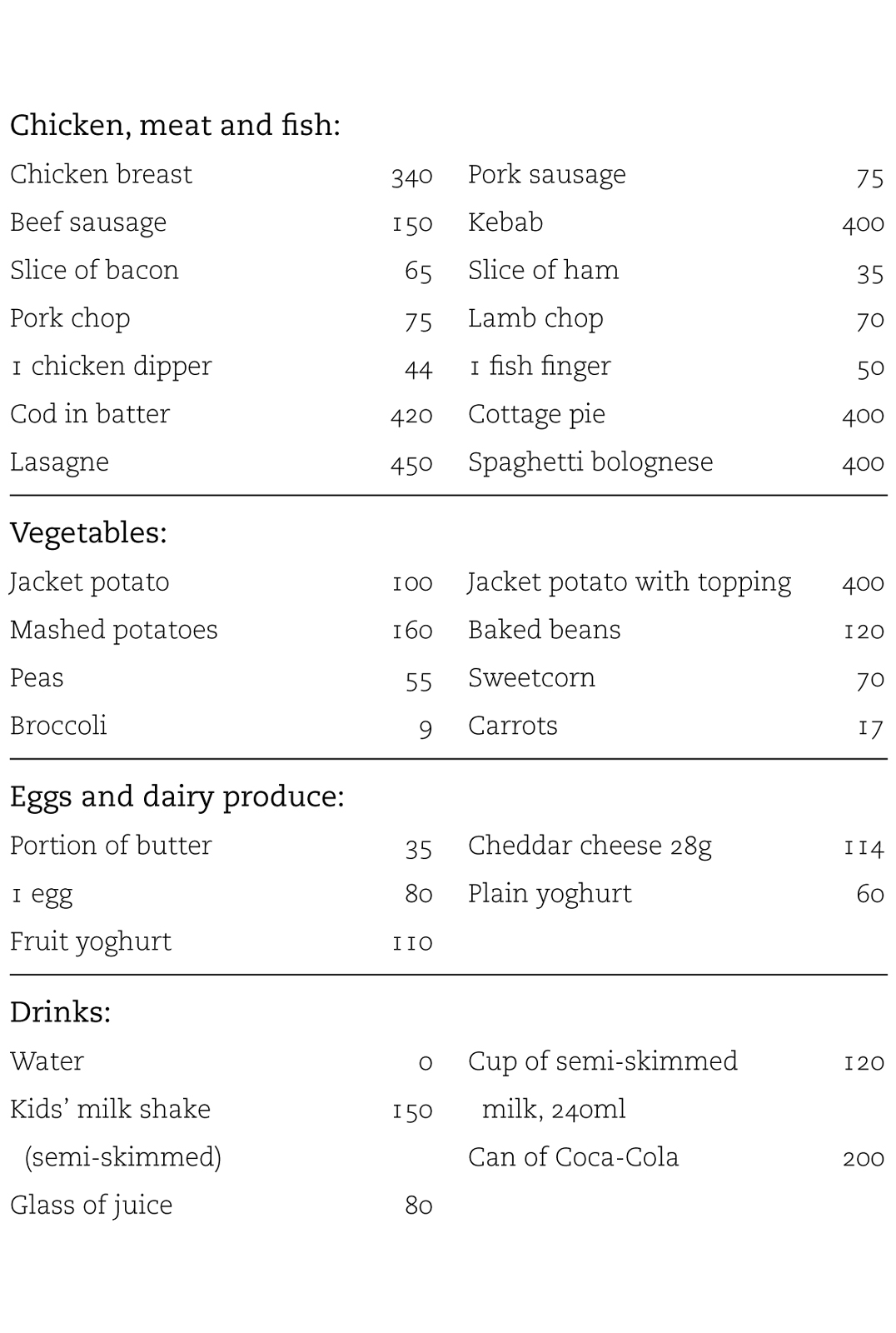 Everything we eat or drink, except water, contains calories. Most packaged food shows the number of calories the food contains on the label. No child should ever be calorie counting; it is the parent’s or carer’s responsibility to ensure their child receives a good diet, which will include sufficient calories for growth and development but not so many that the child becomes obese. Clearly I haven’t the space here to list the calorific content of all foods but here is the amount of calories in some of the foods popular with children.