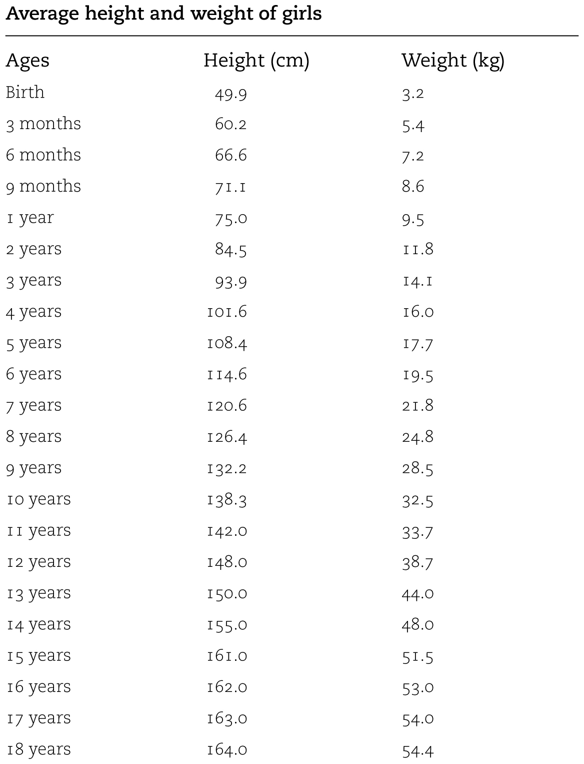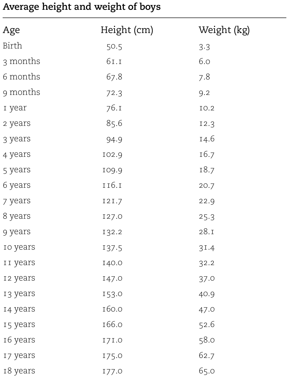 Height and weight charts have largely been replaced by BMI (Body Mass Index) as a way to calculate the correct weight for a child (and adult). However, the calculators can sometimes be complicated to use and the results difficult to interpret, so now follows a general guideline on what your child should weigh at a given height. Remember the heights are averages, so your child will very likely be slightly above or below.