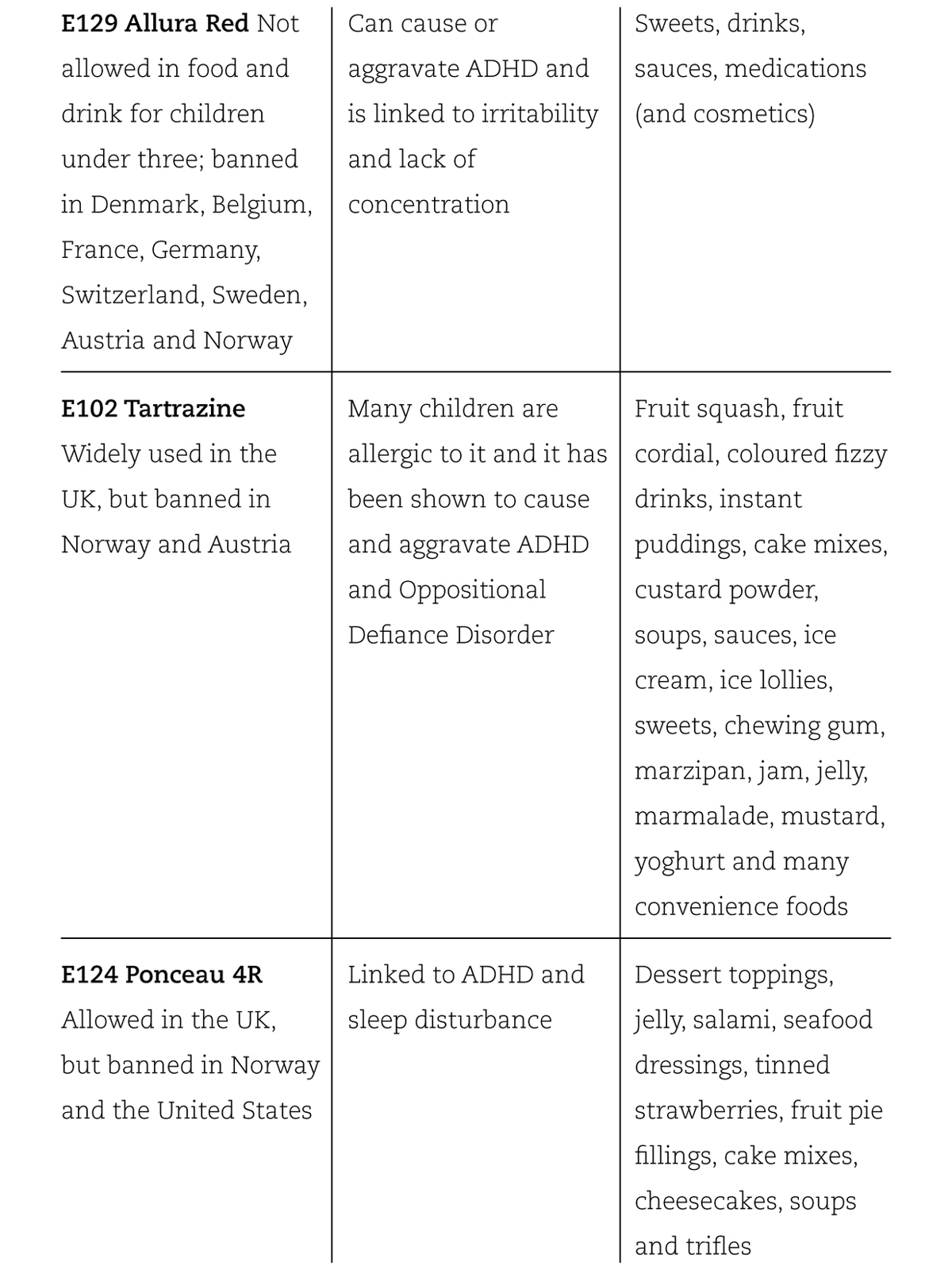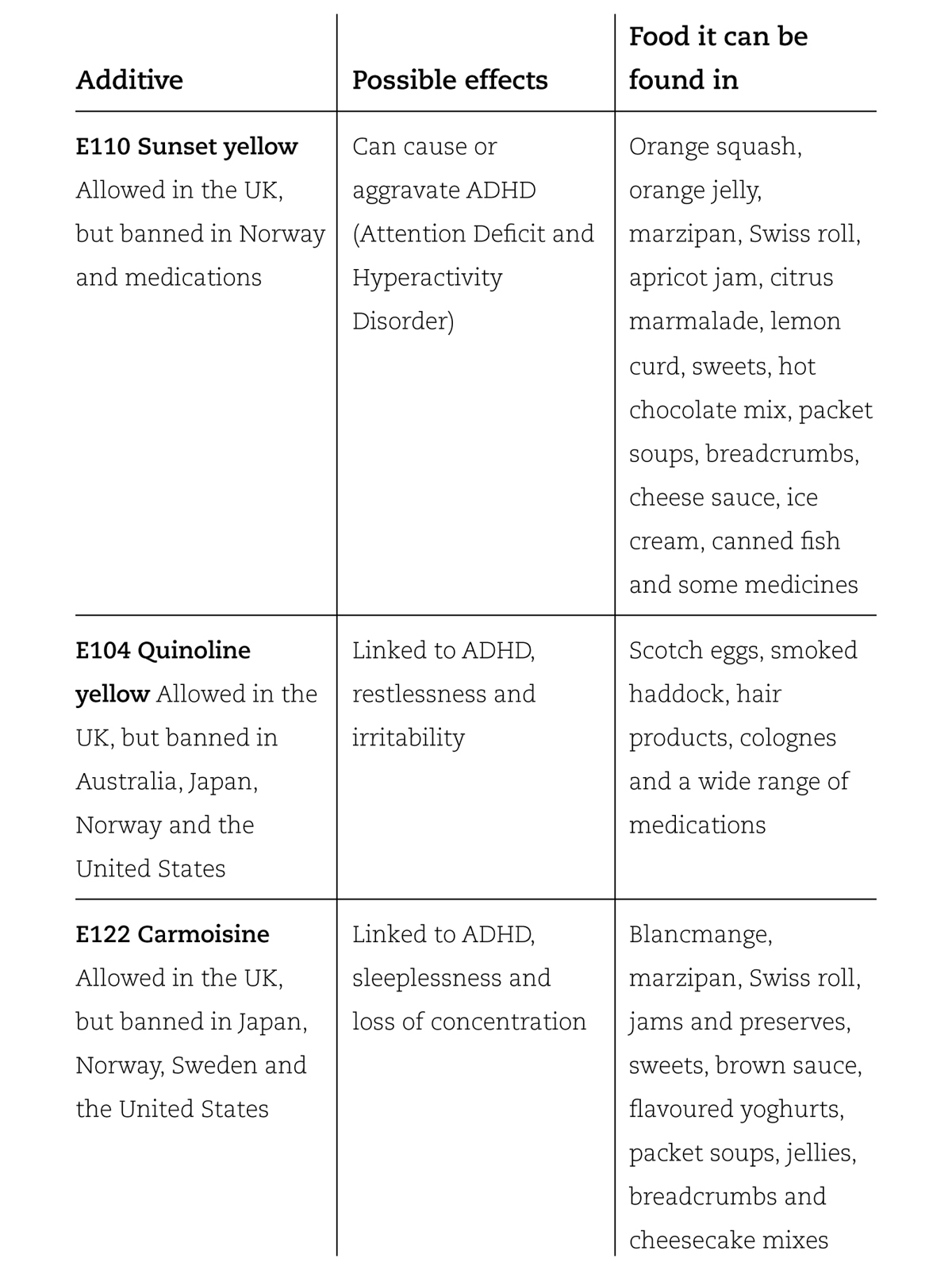 Not all additives are synthetic or have harmful effects, and some have been used for years. Many children suffer no ill effects from eating additive-laden processed food, although cause and effect may not be recognized. While you may spot a link between the stomach ache or sickness your child develops after eating a specific food, a headache after eating a doughnut with bright pink icing, for example, may be missed. The full- and long-term effects of consuming additives are not known and research is ongoing. But there is enough evidence to show that as well as some children experiencing physical reactions to additives, mood, behaviour, learning, energy levels and concentration can be affected. Here is a list of additives that research has shown can cause problems in behaviour, but the list is by no means complete: