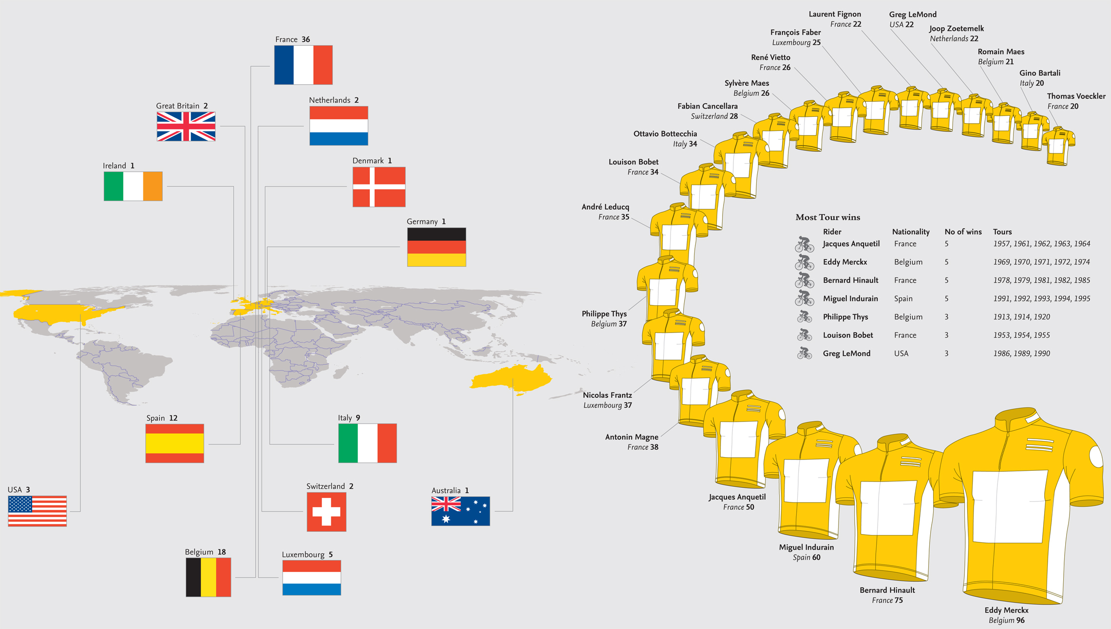 Host cities such as Paris, Lyon, Marseille and Bordeaux have appeared regularly on the route since the Tour’s first edition in 1903, and as cities in countries other than France were added, so, too, grew the breadth of contenders. As well as ever-increasing numbers of riders from neighbouring countries like Belgium, Luxembourg, Switzerland, Italy and Spain, ‘international milestones’ include the first participation by an African rider, Tunisian Ali Neffati, at the 1913 Tour, and the first riders from Australia – Snowy Munro and Don Kirkham – a year later in 1914. In 1937 came the first British riders – Bill Burl and Charles Holland – although neither finished; it wasn’t until 1955 that Brian Robinson and Tony Hoar became the first Brits to complete the Tour. Greg LeMond became the first American stage winner in 1985 and, after the Colombia-Varta team’s appearance at the Tour in 1983, Victor Hugo Peña becoming the first Colombian to wear the yellow jersey, albeit for only three days, in 2003.