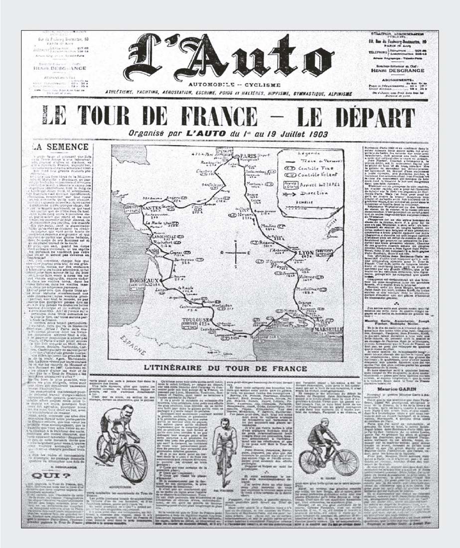 Despite the proliferation of anti-Dreyfusard advertisers, the new title struggled when it came to sales, and in November 1902 – over lunch, bien sûr – one of L’Auto’s writers, Géo Lefèvre, came to his ailing paper’s rescue by proposing a ‘Tour de France’ bicycle race. The rest is history.