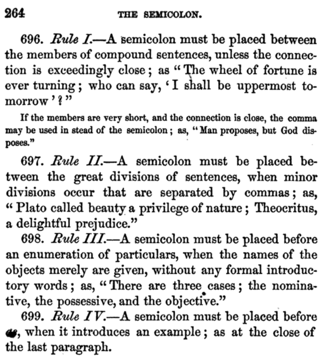 Uncertain of punctuation’s proper classification, some grammarians simply left it out of their books entirely, sidestepping the problem of making rules that would be appropriate for an observation-based, natural science of language. Where punctuation was included in mid-1800s manuals, however, writers were given ample opportunity for semicolon use. In George Payn Quackenbos’s 1862 An English Grammar, four possibilities for semicolon usage were given, and students were instructed to use a semicolon (not a colon, as we moderns would) to introduce a list of items.