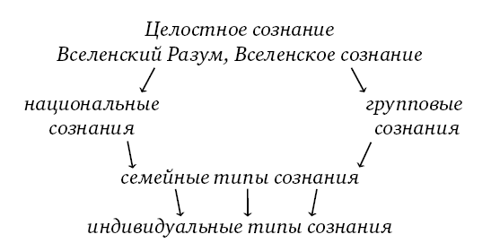 Вы знаете, в каждой семье присутствует семейный код – свод семейных законов, который обусловливает поведение всех членов семьи. Любую модель поведения можно понять и предсказать, зная эти законы. Семейный код определяется конкретными индивидуальными сознаниями: сознанием матери, отца, бабушек, дедушек и других членов семьи. Какие бы проблемы, какие бы модели поведения не присутствовали в семье, в том числе и модели деградирующего поведения, их можно найти на приведенной схеме. Сознание каждого человека относится к сознанию определенной группы, которая подчиняется определенным законам. Наша задача: возвращение человека от этих «примитивных» форм сознания к более высокому, Божественному сознанию.