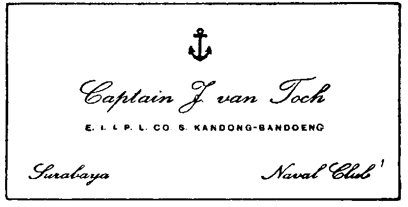 – Передайте ему, что с ним хотел бы поговорить captain van Toch из Сурабаи. Ja, – вспомнил он, – вот моя карточка.