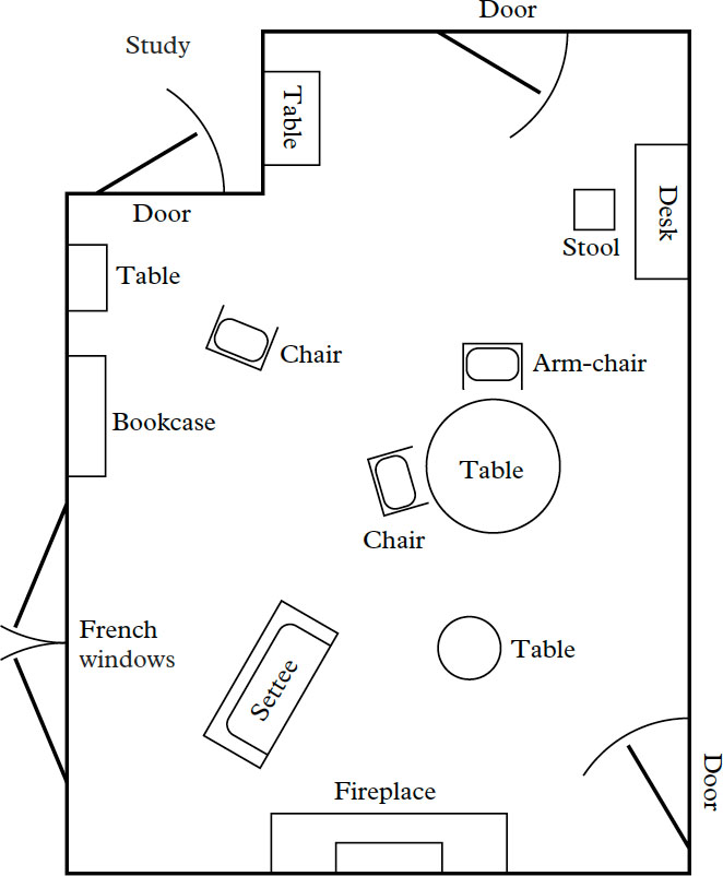 The library furniture consisted of a tall bookcase with a tin box on the top of it, a desk with a telephone on it, a stool, a small table with a gramophone and records, a settee, a coffee table, an occasional table with book-ends and books on it, two upright chairs, an arm-chair, and another table on which stood a plant in a brass pot. The furniture in general was old-fashioned, but not sufficiently old or distinguished to be admired as antique.