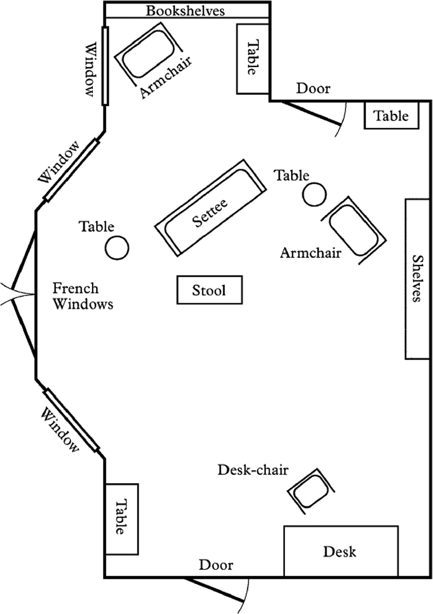 A minute or two passed before the driver emerged from the vehicle, slamming the door behind him. He was a somewhat thick-set, sandy-haired man of about thirty-five, with an outdoor look about him, dressed in a rough tweed suit and dark overcoat and wearing a hat. Using a torch to find his way, he began to walk cautiously across the lawn towards the house, stopping halfway to survey the eighteenth-century building’s elegant façade. The house appeared to be in total darkness as he approached the French windows on that side of the edifice which faced him. After turning to look back at the lawn he had crossed, and the road beyond it, he walked right up to the French windows, ran his hands over the glass, and peered in. Unable to discern any movement within, he knocked on the window. There was no response, and after a pause he knocked again much louder. When he realized that his knocking was not having any effect, he tried the handle. Immediately, the window opened and he stumbled into a room that was in darkness.