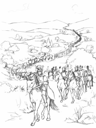 After the wagons came more two-wheeled carts, loaded with slabs of meat and other supplies. Twenty carts made up this group, and they were followed by a dozen foot-soldiers carrying swords and spears.