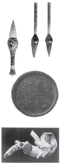 Каллиграфия, утонченное и сложное искусство, требует использования специальных приспособлений, многие из которых сами по себе являются произведениями искусства, например тушечница из прессованной туши (в центре), фарфоровые и нефритовые кисти (наверху) и подставка для кистей (внизу), выполненная в форме цветка сливы