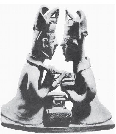 Фаянсовая скульптура периода династии Цин изображает двух писцов с принадлежностями для письма