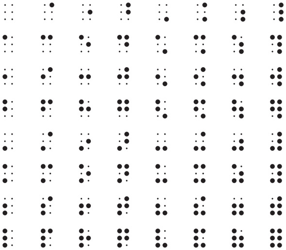 На данный момент нас должно заинтересовать, что эти точки двоичны. Любая точка может быть либо выпуклой, либо плоской. Таким образом, шрифт Брайля подчиняется тем же принципам, которые знакомы нам из азбуки Морзе и комбинаторного анализа. Известно, что в клетке шесть точек, и каждая точка может быть плоской или выпуклой, поэтому общее число комбинаций, которые складываются из шести плоских или выпуклых точек, равно 2 × 2 × 2 × 2 × 2 × 2, или 26, или 64.