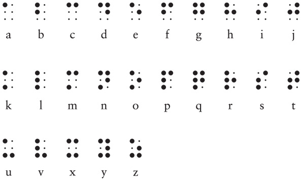 Именно такова основа шрифта Брайля в редакции самого Брайля – как минимум что касается латиницы. Луи Брайль также разработал коды для букв с диакритическими знаками (они часто встречаются во французском языке). Обратите внимание: здесь нет кода для буквы w, которая в классическом французском не используется. (Не волнуйтесь, и эта буква вскоре появится.) Пока мы учли всего 25 из 64 возможных кодов.