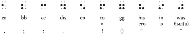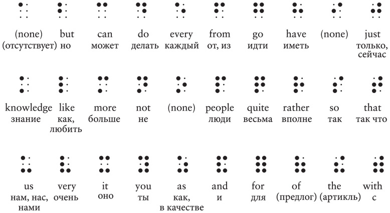 Вот мы и описали 31 код: пробел без точек, который ставится между словами, и три строки по десять кодов, используемых для обозначения букв и слов. Мы до сих пор и близко не израсходовали 64 теоретически доступных кода. Как мы убедимся, в сокращенном Брайле ни один не остался без дела.