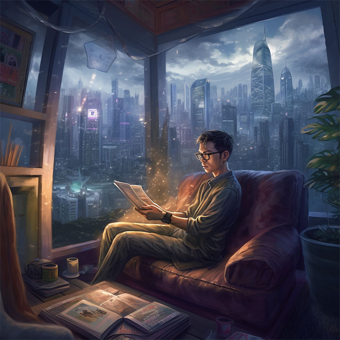 Утомившийся инженер подошел к столу с инструментами, взял свою толстую книжку и неспешно пошел в комнату с диваном у большого панорамного окна. На смежной стене висел большой тонкий экран, способный делать проекцию чего-либо в пространство комнаты. Стоял большой удобный дубовый стол, и открывался вид на утренний и еще темный Гонконг, переливающейся разноцветными неоновыми огнями и огромными инсталляциями 3D рекламы размером со здания. На улицах города ручьями по воздушному пространству такси-дроны перевозили людей, а по небу летали информационные облака, передавая новости напрямую в нейронные импланты прохожих. Несмотря на раннее утро жизнь била ключом.