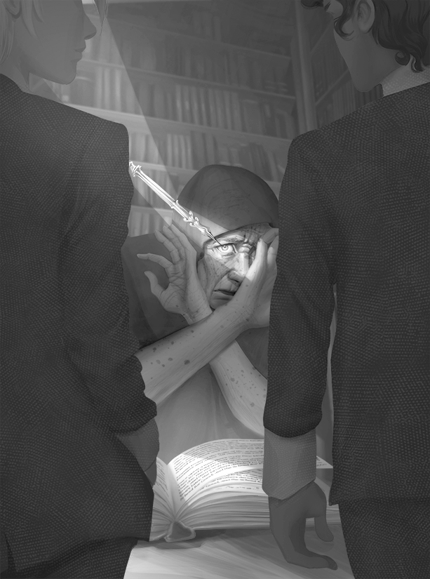 Справедливый вопрос, учитывая, что Директора школы спали в башне, уставленной шкафами с тысячами сказок. Но сейчас владелица лавки, мисс Харисса, с растрепанными седыми волосами, в красном твидовом пальто и того же цвета шляпке, похожей на зонтик, быстрыми шагами вышла из дальней комнаты, размахивая изумрудно-зеленой книгой.