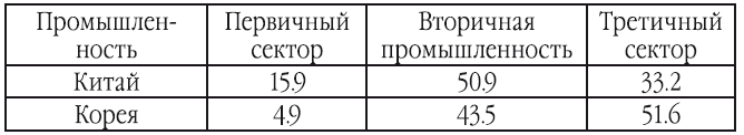 Добавленная стоимость трех отраслей промышленности как доля ВВП в Китае и Корее в 2000 году (%)