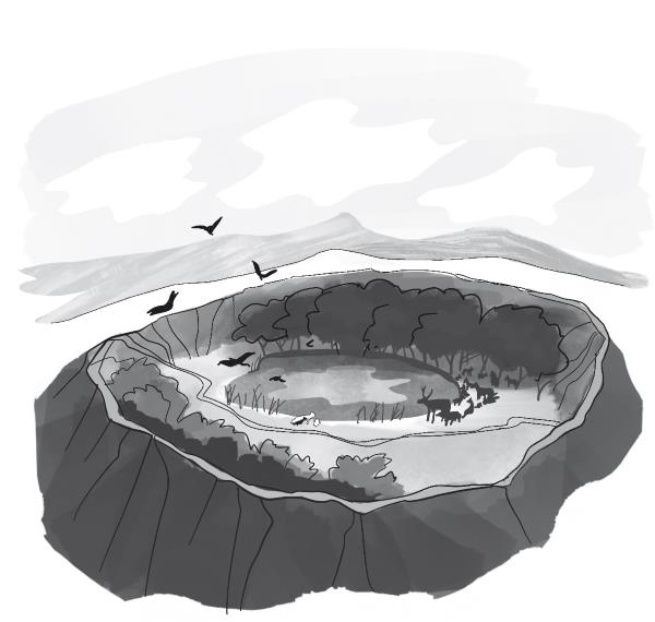 Дилла и друзья следовали за ними и наконец дошли до места, где заканчивался лес. Вслед за толпой поднявшись на холм, друзья увидели внизу зелёную поляну под открытым небом. В золотых лучах солнца луг, как на красочной картине, переливался жёлтыми, красными и зелёными осенними красками. Оказалось, что охваченная кольцом деревьев поляна лежала в кратере извергшегося десятки тысяч лет назад вулкана. В центре блестело небольшое озеро, гладь которого, словно зеркало, отражала голубое небо и белые облака. Издалека оно походило на большой зелёный глаз.