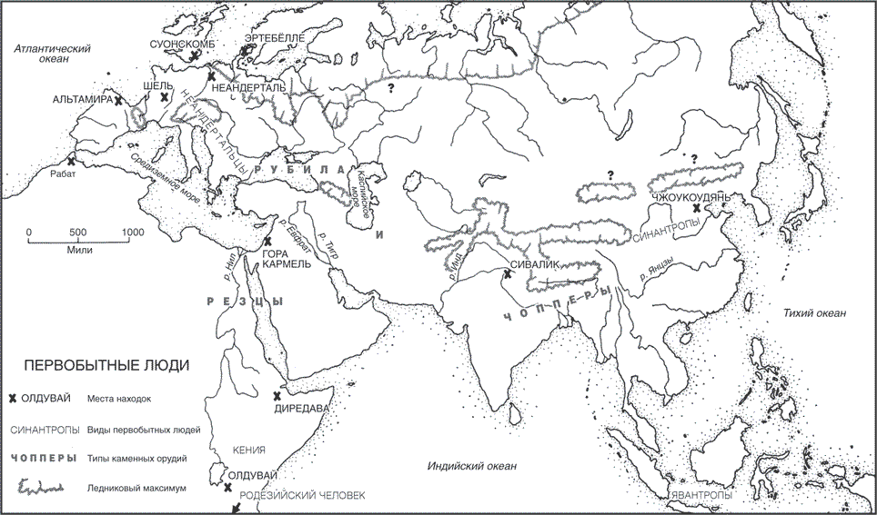 До сих пор эволюцию человека нельзя проследить подробно, однако можно с уверенностью утверждать, что около 25000 года до н. э. на всей заселенной людьми территории преобладал современный вид человека – Homo sapiens, а все другие его виды так или иначе исчезли. В Европе, где доказательства наиболее убедительны, Homo sapiens с новыми, более совершенными орудиями труда внезапно появился примерно в это время. Здесь он вытеснил знаменитый ранее существовавший вид неандертальца, обладавшего коротким мощным телом, скошенным подбородком, покатым лбом и массивными надбровными дугами. К сожалению, ныне неизвестны ни место, ни время, ни то, каким образом возник наш вид человека, однако некоторые находки наводят на мысль, что предки Homo sapiens появились в истории человечества очень давно.