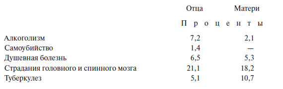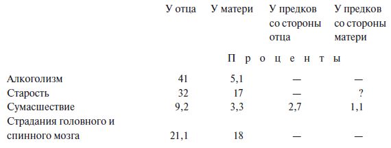 Что касается наследственности, то она прежде всего зависит от пожилого возраста родителей, от алкоголизма, раздражительности отца, затем, на втором плане, от сумасшествия или преступности родителей.