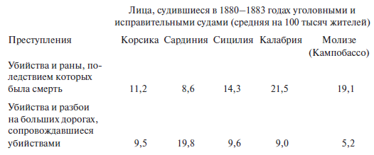 Сравнивая между собой число лиц, осужденных за убийство в течение 1880–1883 годов на Корсике, с числом таких же осужденных в наиболее преступных областях Италии, мы получаем следующие данные: