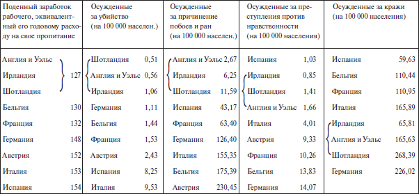 4. Между поденной платой и кражами нет, по-видимому, никакой связи: преступления эти колеблются в очень широких размерах в Испании, Бельгии, Франции и Италии совершенно независимо от заработков населения этих стран.
