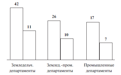 Так, если мы разделим Францию на земледельческие, земледельческо-промышленные и промышленные округа, то увидим, что преступность нарастает тем в большей степени, чем более промышленность преобладает над земледелием. Нижеследующая диаграмма показывает, что из 42 земледельческих департаментов только 11, то есть 23 %, превосходят по числу наблюдаемых в них убийств среднее количество их во Франции, между тем как из 26 земледельческо-промышленных департаментов его превосходят 10, то есть 38 %, а из 17 промышленных – целых 7, то есть уже 41 %.