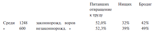 В вюртембергских тюрьмах насчитывалось незаконнорожденных среди заключенныхв 1884–1885 годах – 14,3 %; в 1885–1886 годах – 16,7 %; в 1886–1887 годах – 15,3 %; между тем как среди свободного населения они составляли в это время в среднем только 8,76 %. Зихерт при исследовании 3181 заключенного в тех же тюрьмах нашел между ними даже 27 % незаконнорожденных, распределявшихся следующим образом: