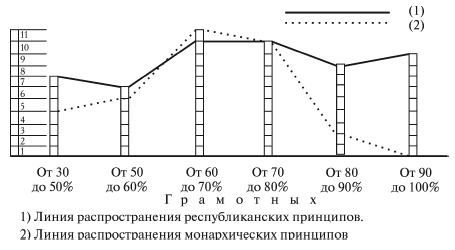 8) Образование. После всего сказанного становится вполне понятным, что эволюция идет быстрее там, где шире распространено образование. Как видно на диаграмме, департаменты, население которых наиболее образованно (90–95 % грамотных), суть чисто республиканские, а в департаментах, средних по образованию, монархисты и республиканцы друг друга уравновешивают. Одного только я не могу себе объяснить – почему республиканцы преобладают также и в департаментах, дающих наименьший процент грамотности.