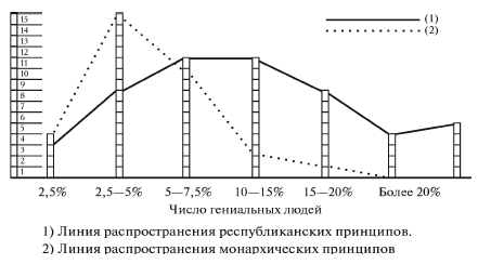 Департамент Сены дает максимум гениальности и минимум реакционных голосов. Точно также республиканские департаменты Вар, Рона, Сена и Уаза, Сена и Марна богаты гениальными людьми, тогда как Вандея, Морбиан, Па-де-Кале, Нор, Верхние и Нижние Пиренеи, Жер и прочие реакционны и бедны гениальностью. Эта аналогия до такой степени полна, что маскирует влияние расы, плотности населения и прочее, что вполне естественно, разумеется.