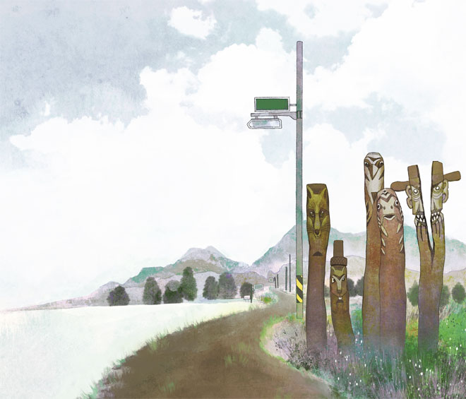 – Смотри! Это стражи, охраняющие деревню! – воскликнул Тэхи, кивнув на пять деревянных столбов возле указателя.