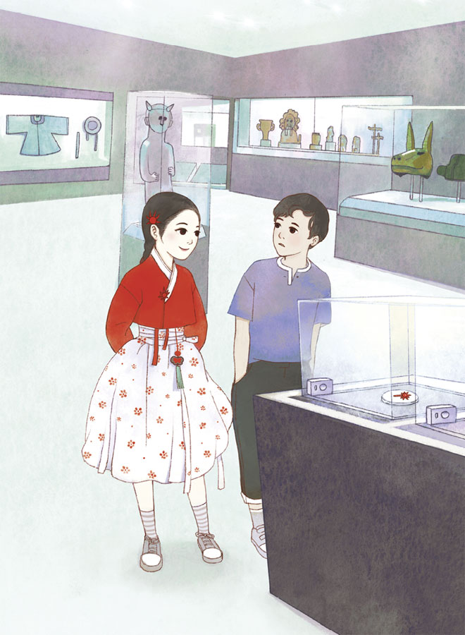 Девочка, одетая в традиционный корейский наряд ханбок с красным верхом и белой юбкой, украшенной мелкими цветочками, подбежала ко мне. Её длинная чёрная коса так и развевалась.