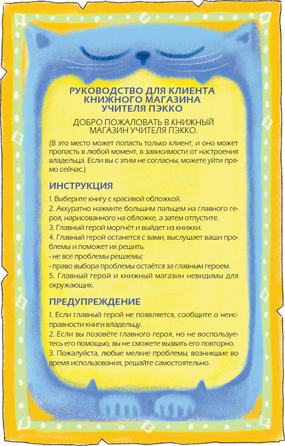 Учитель Пэкко перевёл дух, зашёл в хижину и включил свет. Можно было выбрать из нескольких вариантов освещения: свет луны, цвет граната и цвет спелого мандарина – сегодня он предпочёл последний вариант. Посреди комнаты стоял большой стол, на котором лежали популярные книги. Господин Пэкко положил на самое видное место книгу «Кот, который прожил сто раз». Остальные книги подёргивались, словно выражая своё возмущение.
