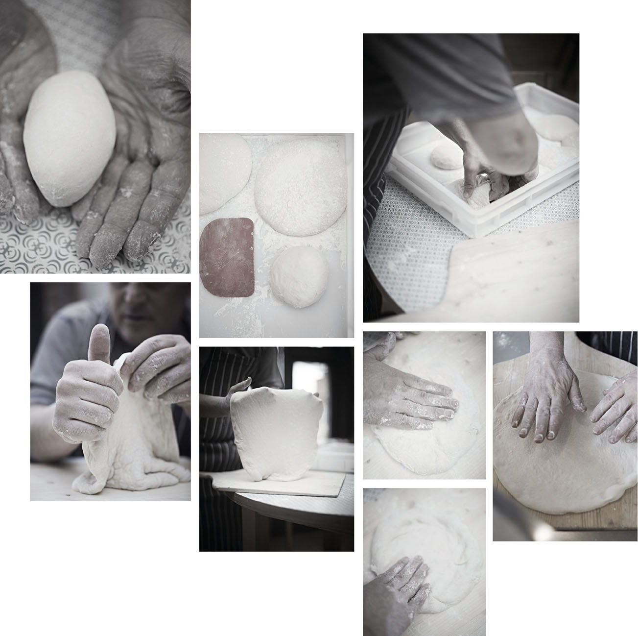 Hold the top edge of a piece of dough with both hands, allowing the bottom edge to touch the work surface, and carefully move your hands around the edges to form a circle of dough. You have to find your own style, but I usually just cup my hand into a C shape, turn my hand knuckle side up, and drape the dough off it, allowing gravity to do its work, so it gently falls onto the floured table. Imagine you’re turning a wheel. Hold that dough aloft, allowing its weight to stretch it into a rough 10-inch circle. Don’t put any pressure on it by pulling or stretching it, just let gravity do the job—you want that aeration and cragginess. Keep it moving, and it will start to relax—like we relax when we are on a sofa.