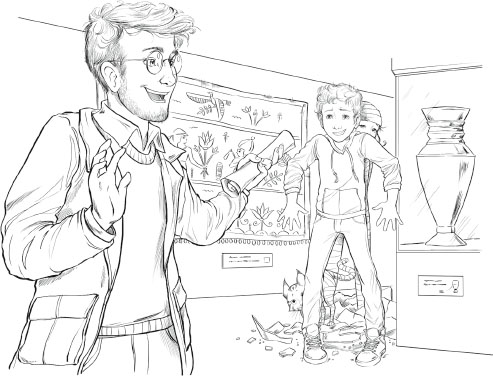 In a panic, Tom glanced around the room. For a second he thought about bundling Isis and Cleo into the shadows. But that would never work. Isis was rooted to the spot, arms folded. Cleo wrapped herself around Isis’s ankles. Tom made do with hastily kicking some of the broken pieces of pottery behind a nearby display case.